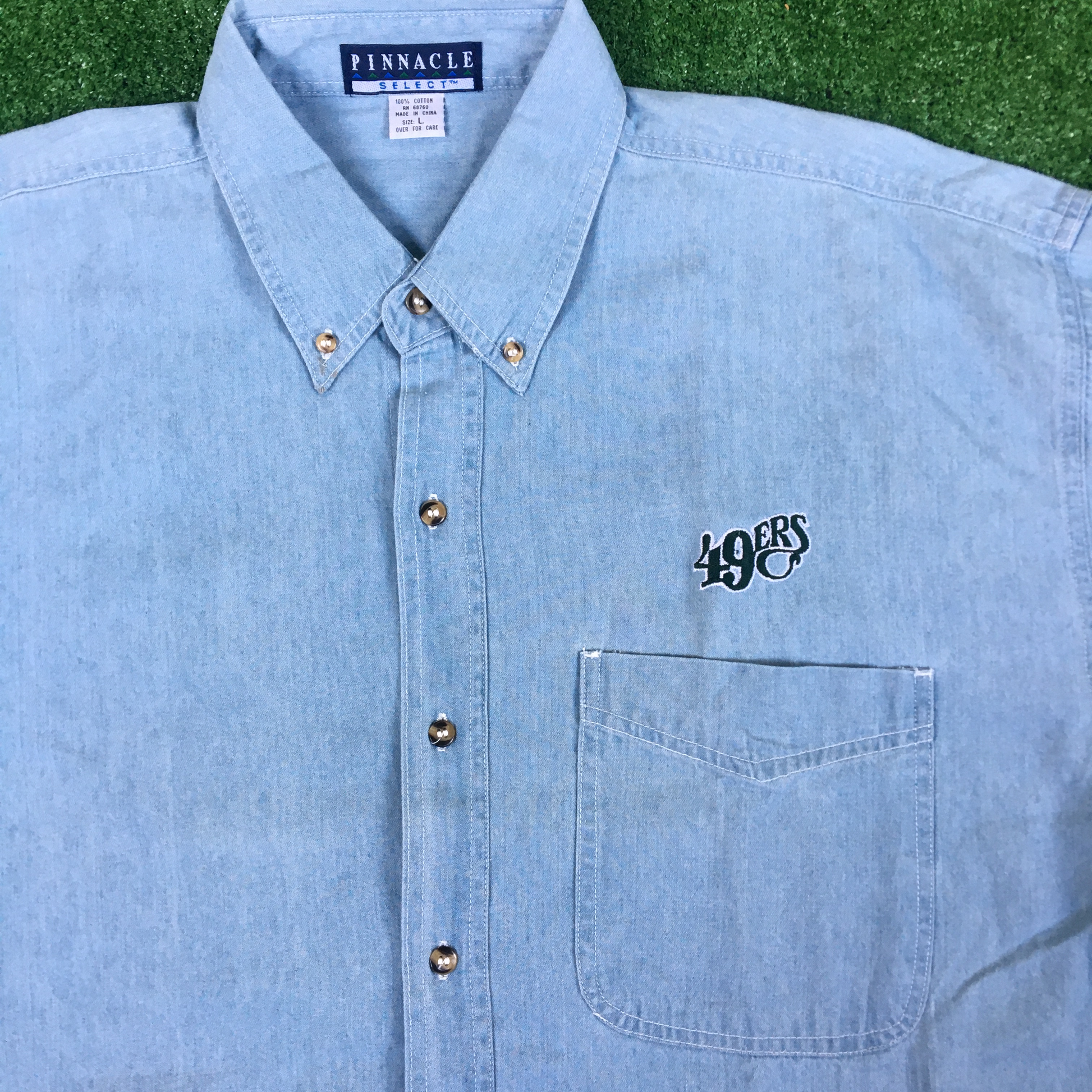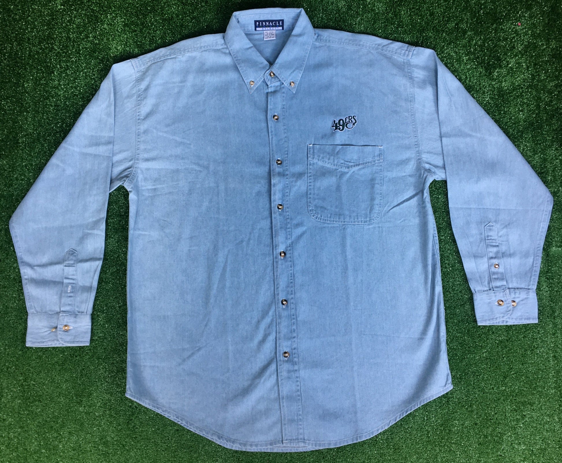 Unique vintage denim button up with "49ers" retro logo embroidered.